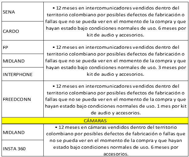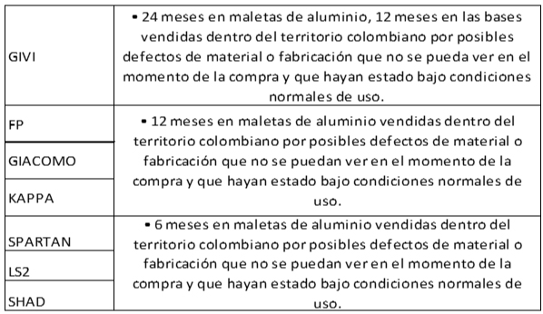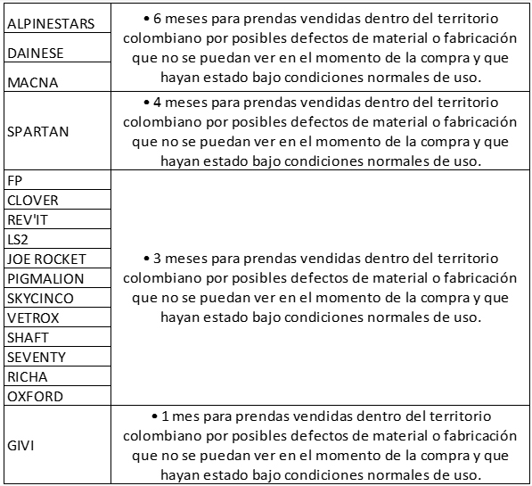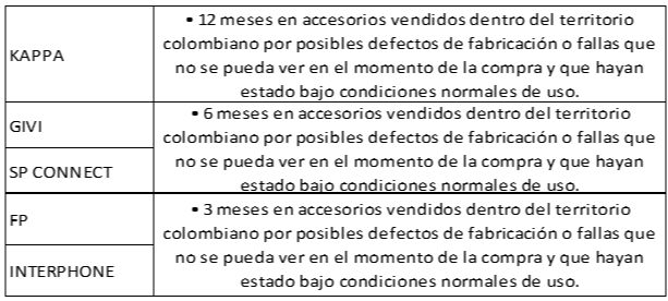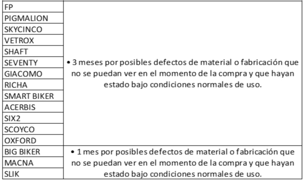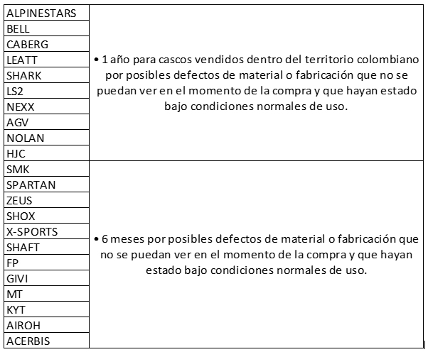 Los siguientes elementos NO están cubiertos por garantía: visor, mecanismos de visor, visor solar, mecanismos de visor solar, pinlock y partes móviles, debido a que son susceptibles a manipulación por parte del usuario.