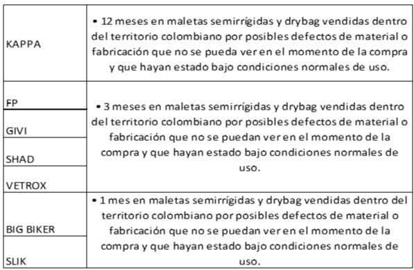 La garantía cubre fallas de fabricación en costuras, cremalleras y cierres.